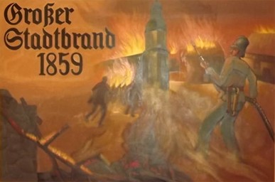 Am 12. August 1859 morgens gegen 2.30 Uhr hallte durch die engen Straßen der Stadt der von allen gefürchtete Ruf " Feuer !". Das Feuer, das in einem mit Feuerholz und Stroh gefülltem Nebengebäude ausbrach und nicht unter Kontrolle gebracht werden konnte, sollte bald die ganze Stadt in Schutt und Asche legen.